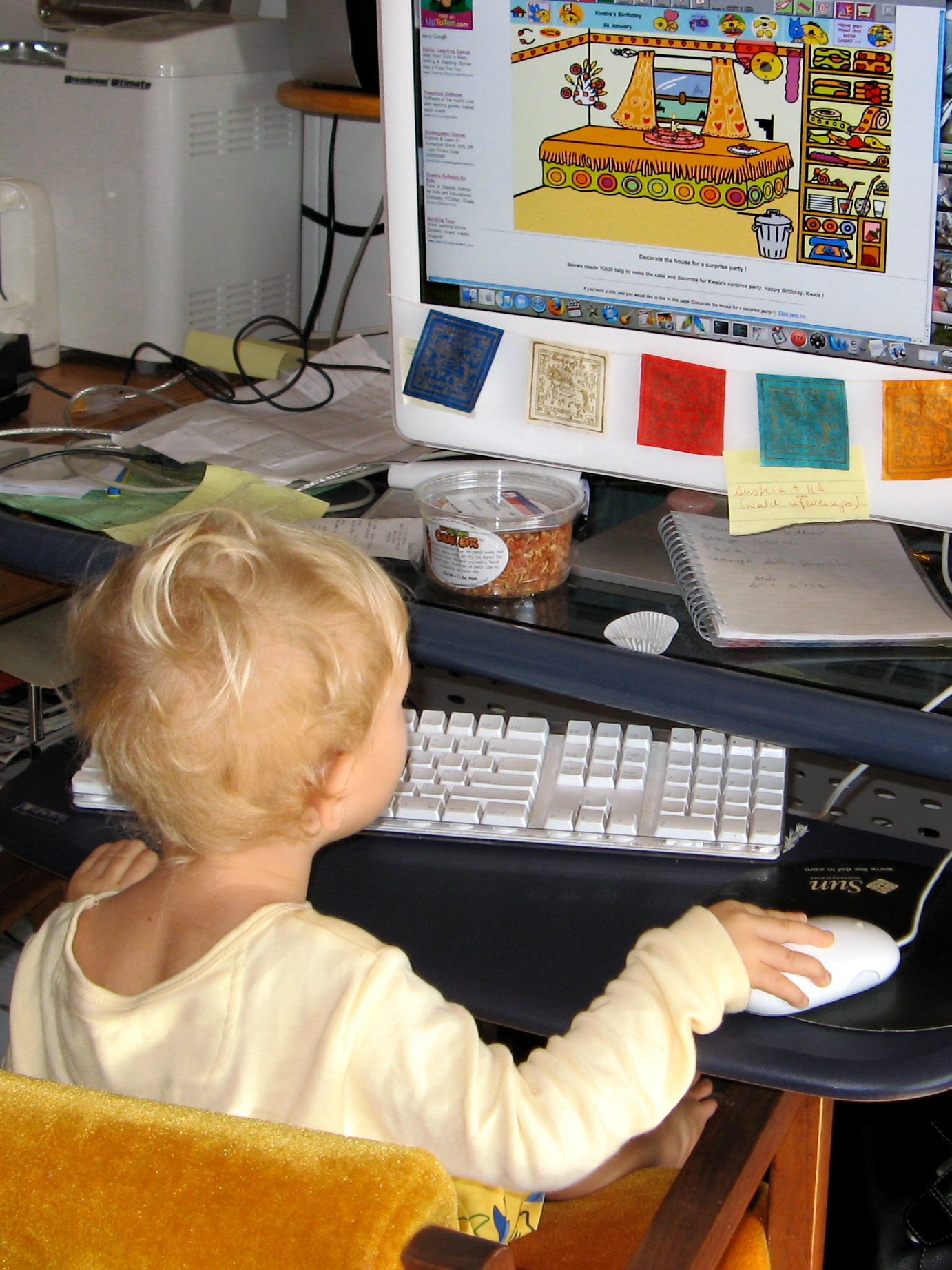 Leilani started to play computer games recently: I had been sick with the worst cold I have ever had since I am an adult, almost 3 weeks of totally stuffy nose, throat and headache, cough… worst of all no energy to move, it made me tired to walk to the neighbors house and back, or even up the stairs. Andy watched Leilani most the time, and when it was my turn, I had no energy to chase her around, and no voice to read to her, so there was a lot of DVD watching and computer (practice) games. Click here and watch some fireworks, make the goldfish swim left and right and leap out his bowl, scratch the kitty – all teaching her to move the mouse pointer.