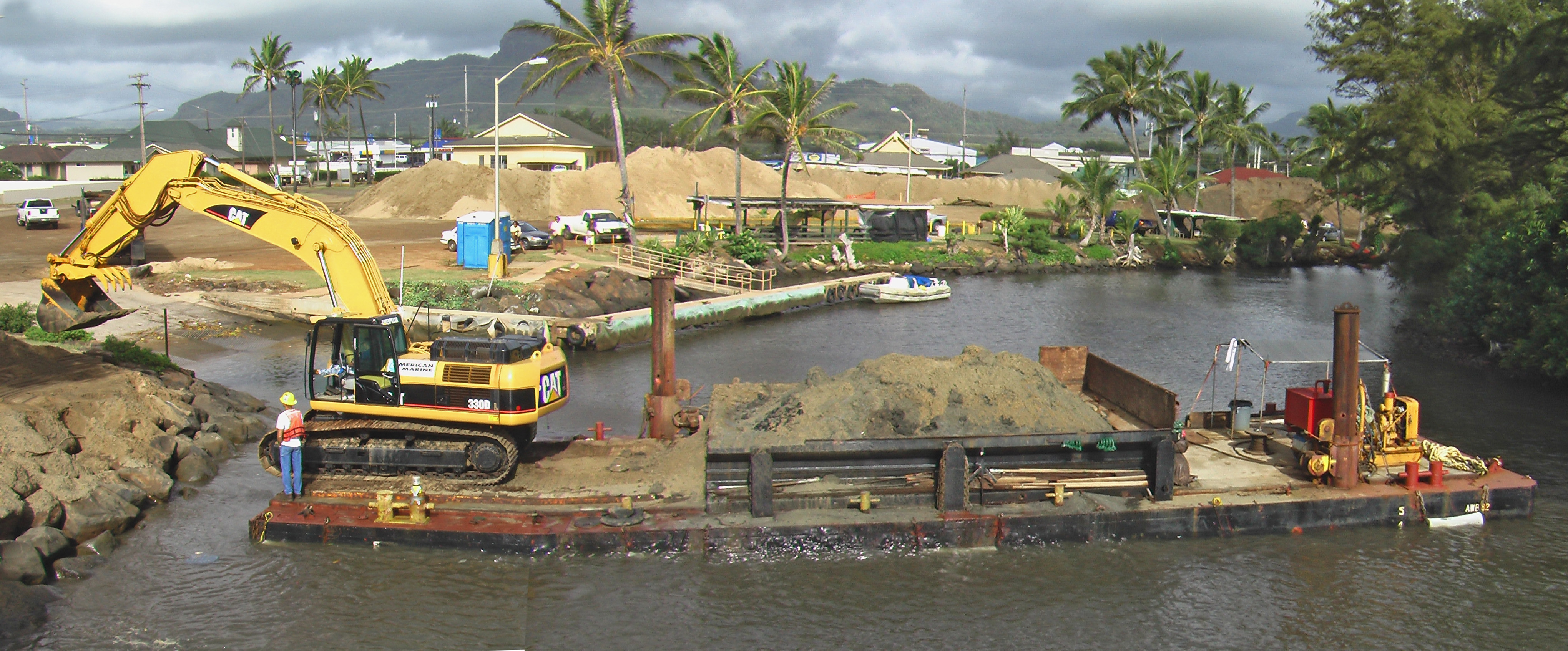 But her favorite attraction of the day were the big machines working back in Kapaa. Below is a dredger (and a very quick photo-stitch) that is making the channel to the boat dock deeper. It is actually an excavator sitting on a barge. After digging in the river-bottom and loading up the barge, they would unload all the sand on the shore, and a front loader would put it in a dump-truck. Then the truck would drive 150 feet (50m) and dump it in big piles that you can see in the background. I don’t know what they plan on doing with the sand, hopefully replenish some of the eroding beaches.
