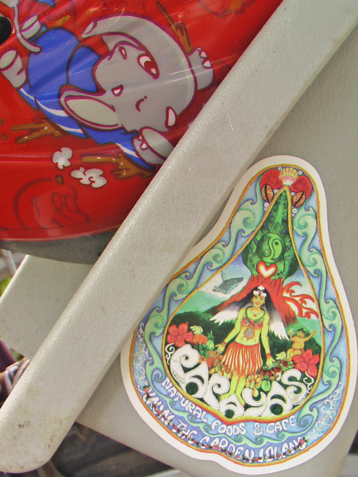 After all this, it was 10:30 and very hot already. I know she loves to play in the water, so I suggested we go to Baby Beach, a little beach near the bike path that is shallow and has no waves at all. But she wanted Lydgate or nothing, and she said she was hungry, so we went to get an early lunch at Papaya’s nearby–and she got a free sticker to put on her bicycle seat. Leilani ran around the grass for a while, and then we biked to the garage not far away. The car was fixed so we loaded the bike again and drove to Lydgate where she swam and splashed happily.