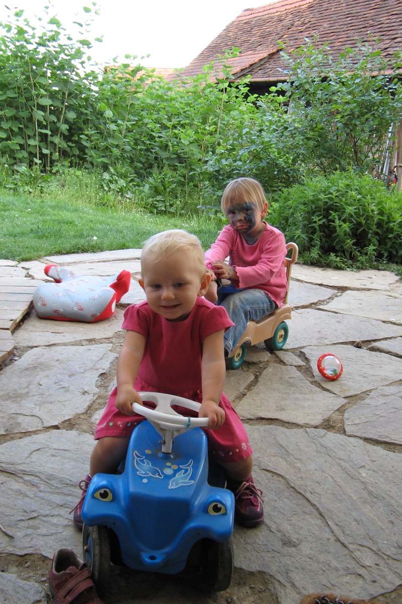 Mostly German… here the transcript: Kind (child), baby, hallo, [does a somersault] somersault, somersault [laughs] another, [plays with plastic heart that opens and Leilani can’t shut it anymore] broken [Andy confirms] heart [I confirm]…[Leilani starts singing and playing xylophone and tambourine] Vidiralala, Vidiralala, … [sees her crayons] malen (painting) … ants … another dinosaurier … [chimes ring] dingdong… [Andy asks “Who’s that?”] dinosaur [Andy corrects, dragon, dragon makes music] Ei-ei drachen (petting the dragon) anziehen (meaning aufziehen, wind-up) drachen anziehen [ Andy turns it back on, asks if she is not scared ] das da? hallo hallo [music off ] anziehen [ music on ] Affi tanzen (Monkey dances)