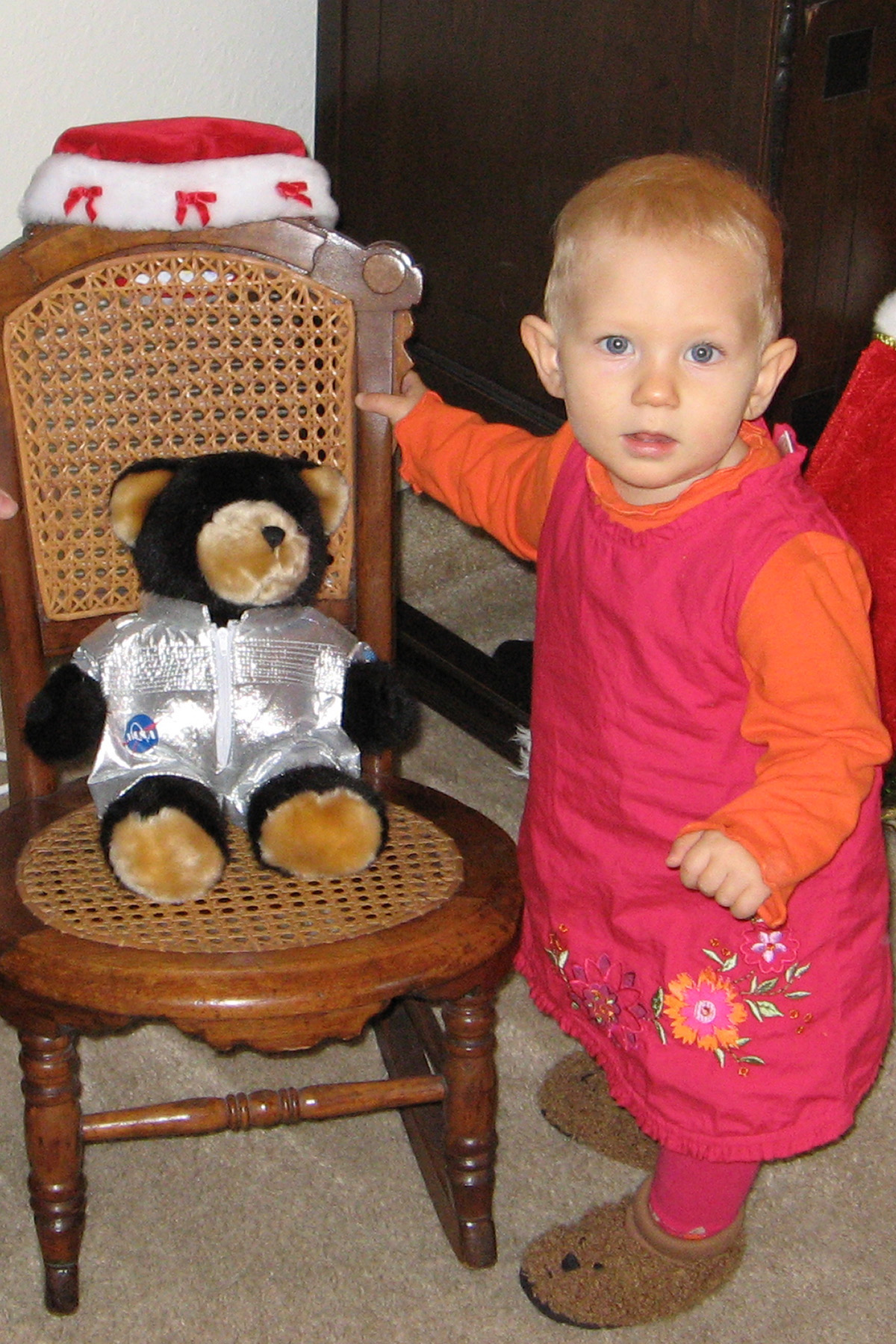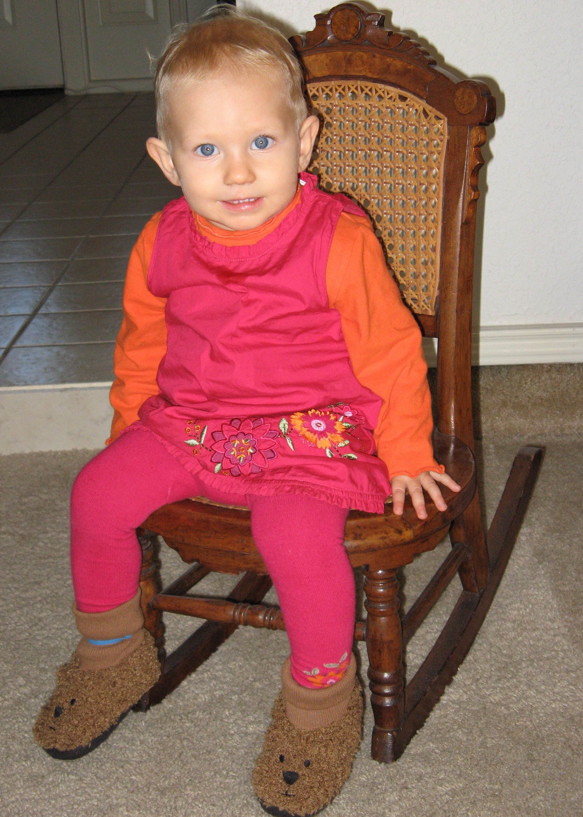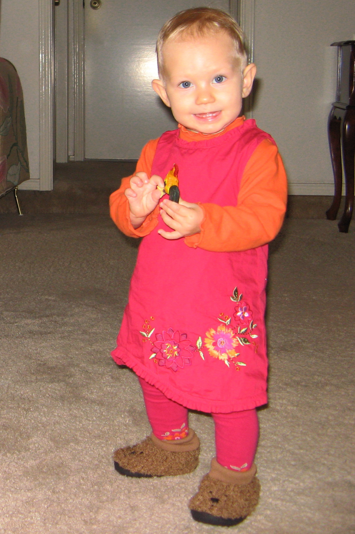 Other recent words are “Buch” (german book) “Sitzi” (german sit), “Momo” (monkey), “Apple” (any remotely round fruit) “Hei-Hei” (german Night-night), “Ducky” “Jesus”, “Sus” (shoes), “leaf”, “Apa” (open), “Moon” and her new favorite “No”. There are also a few new animals sounds, she does the elephant better than I do, and says Mooo for the cow,