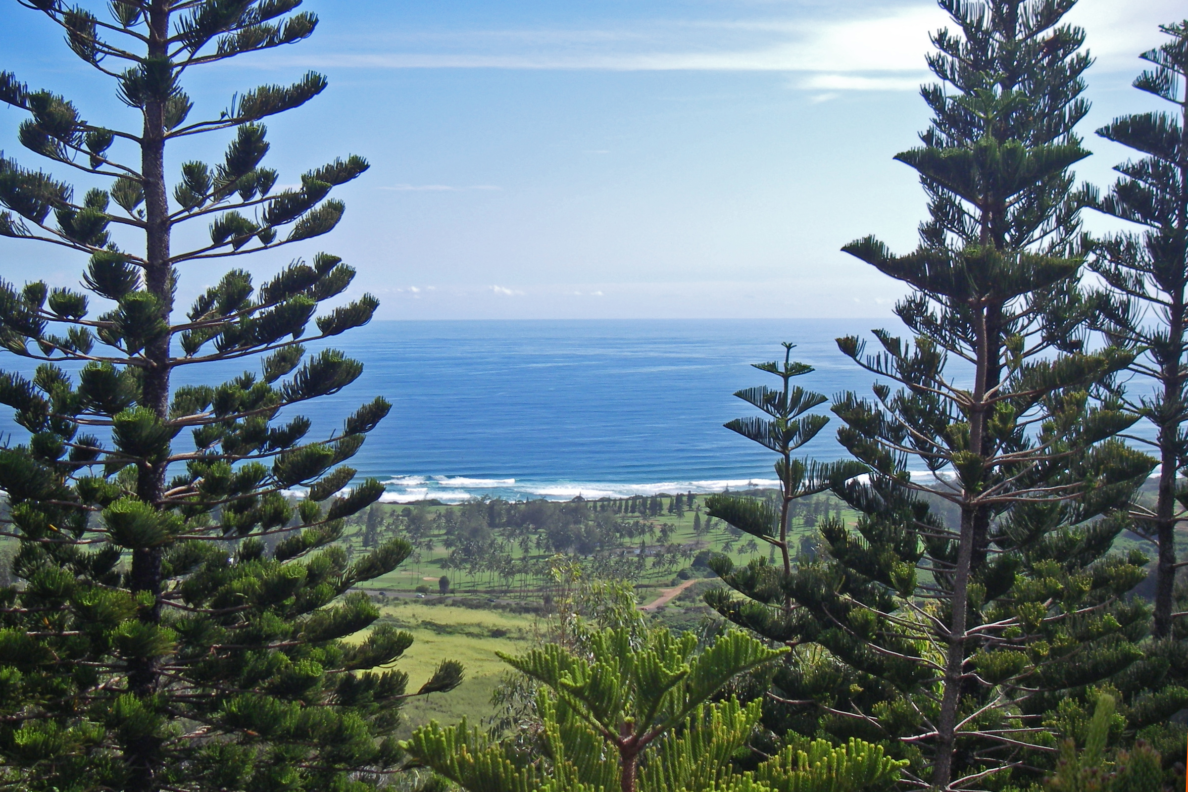 Mauka (mountain-side) view with abandoned cane field—the Sleeping Giant is the hill on the right under the big white cloud, the mountain to the left is Makaleha: