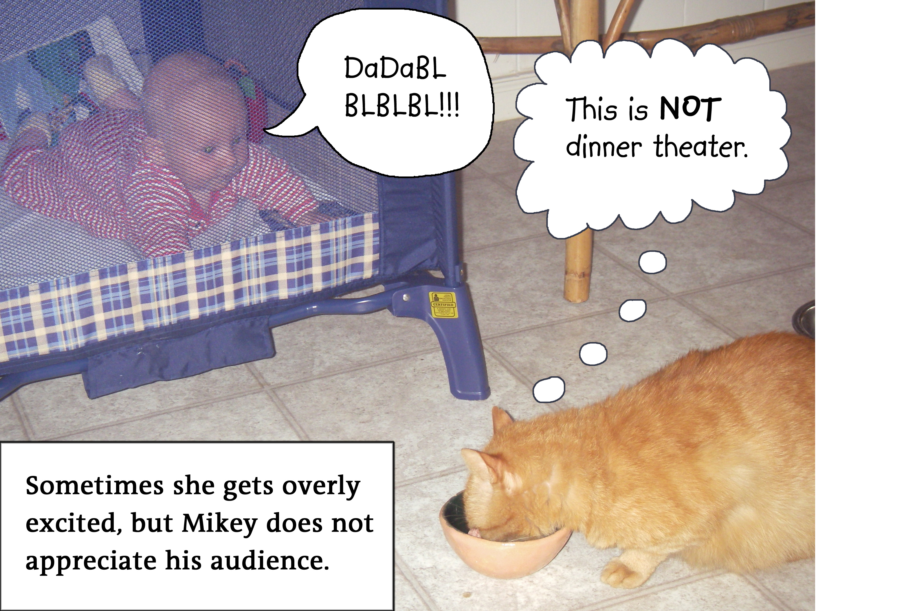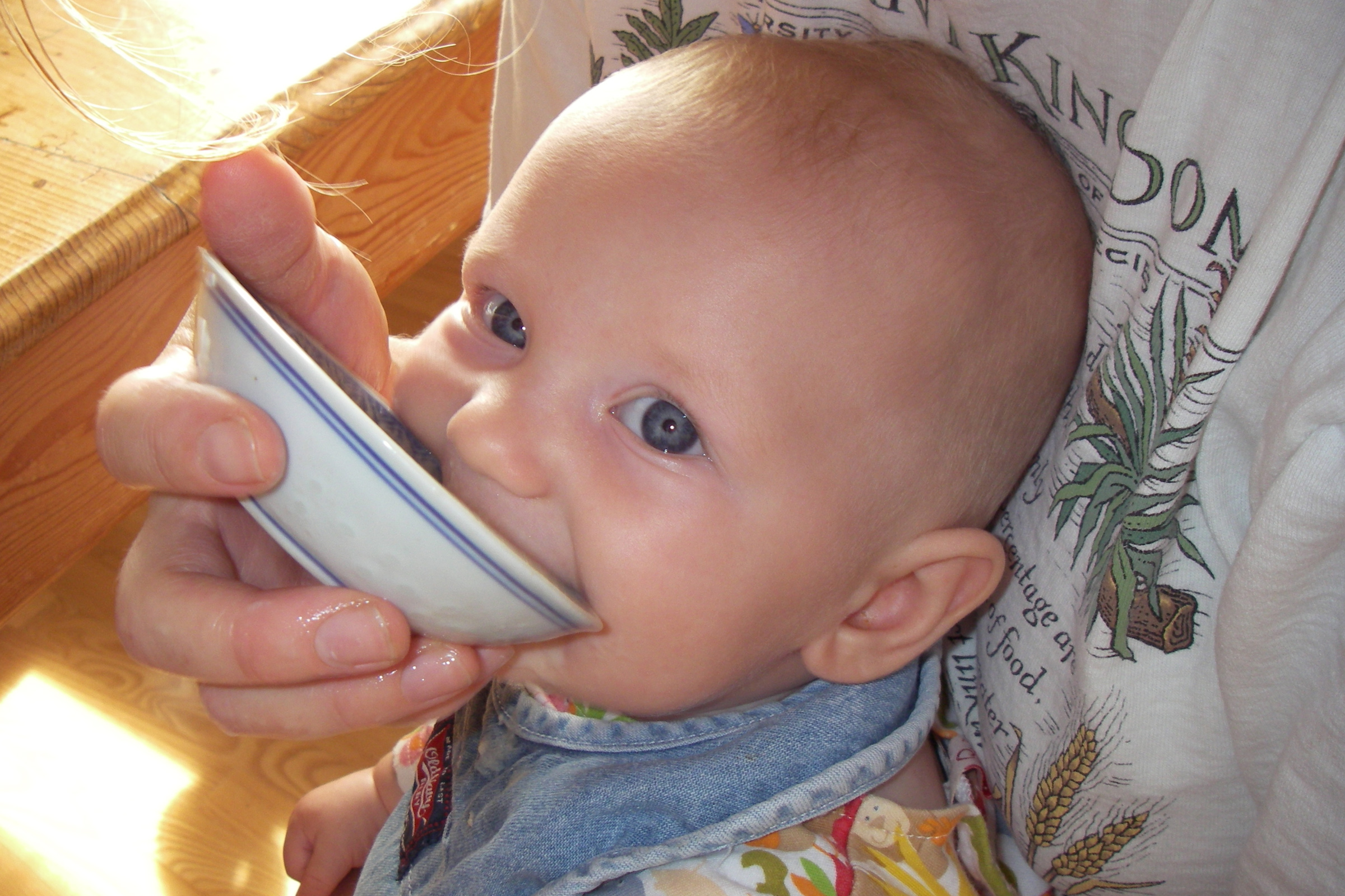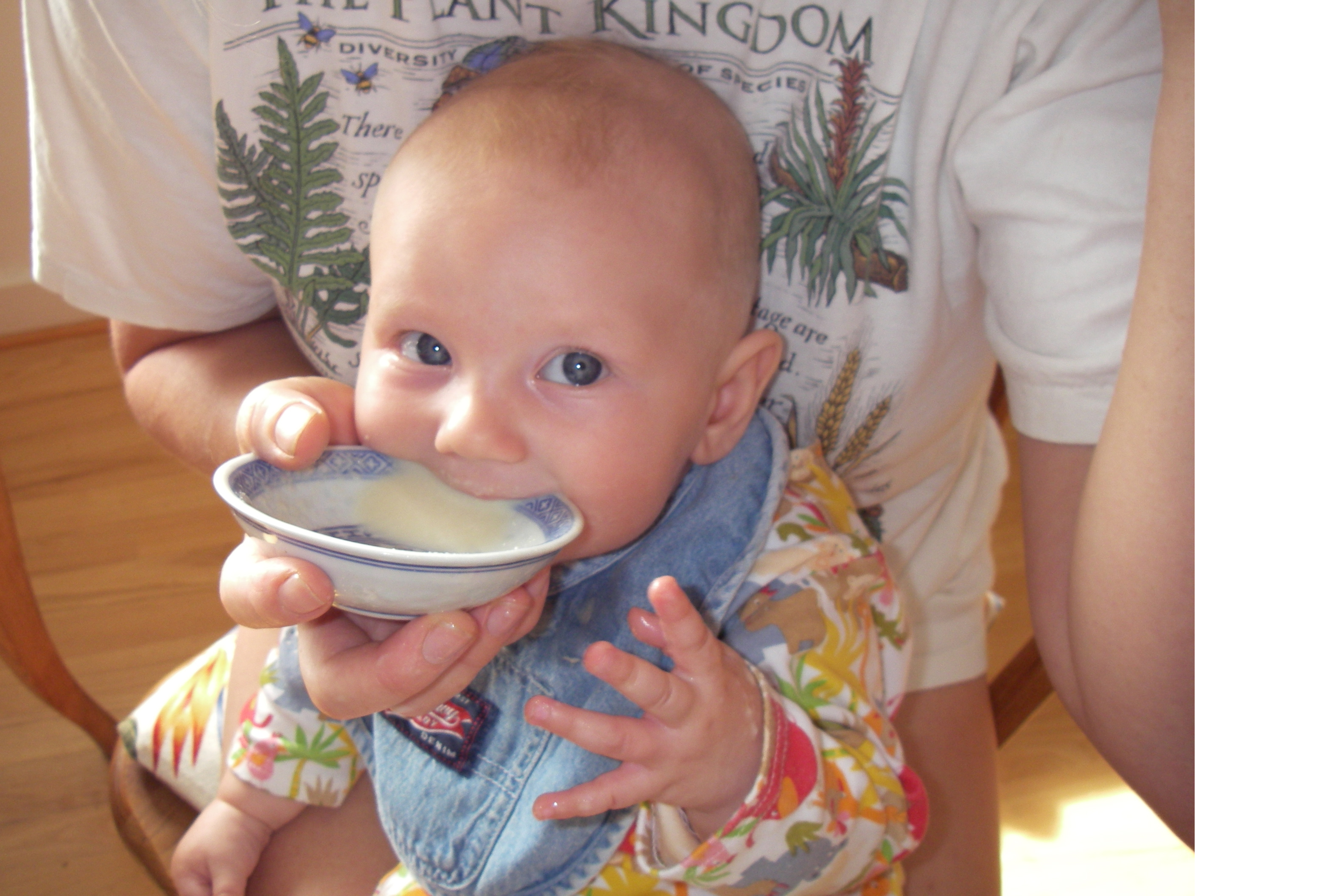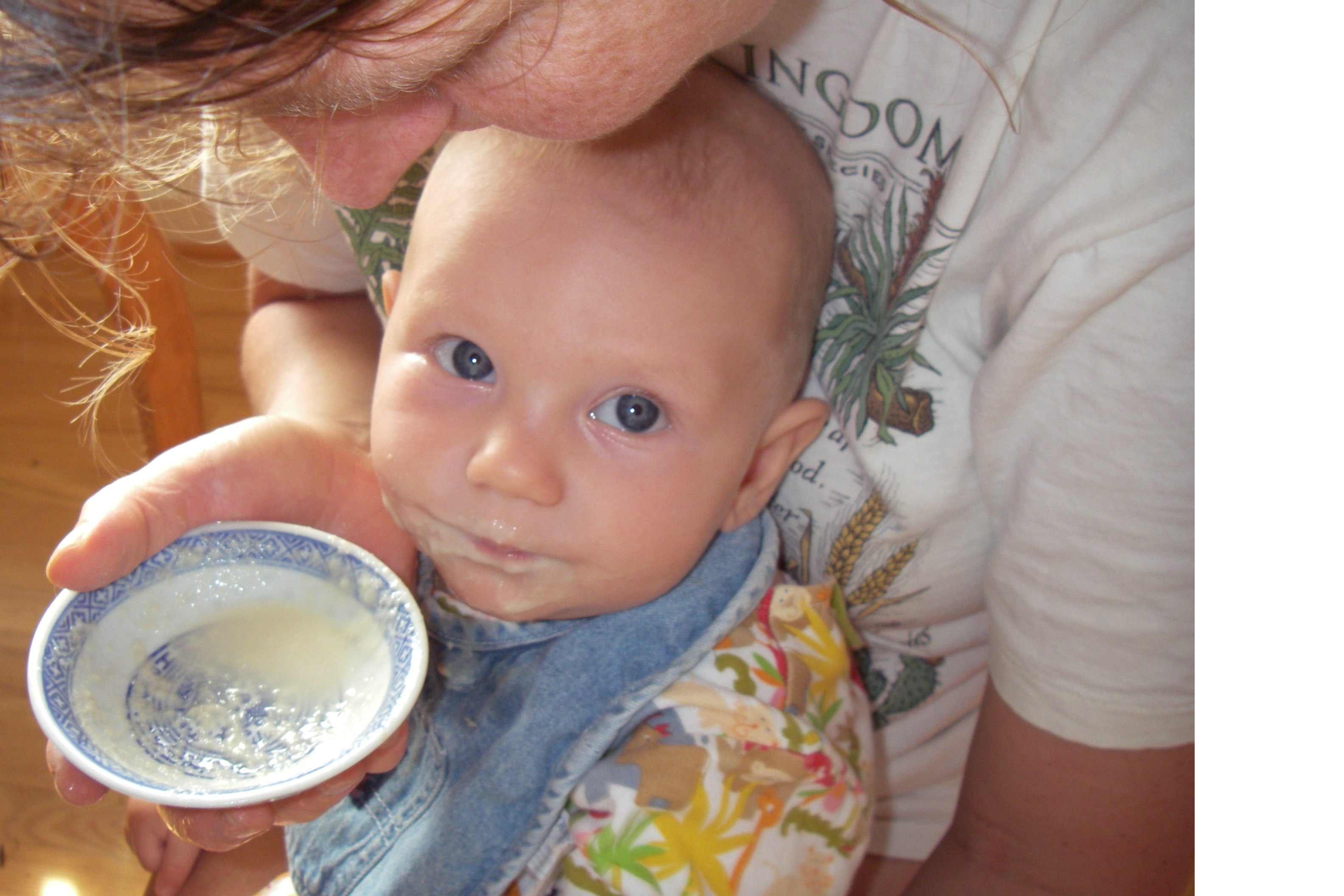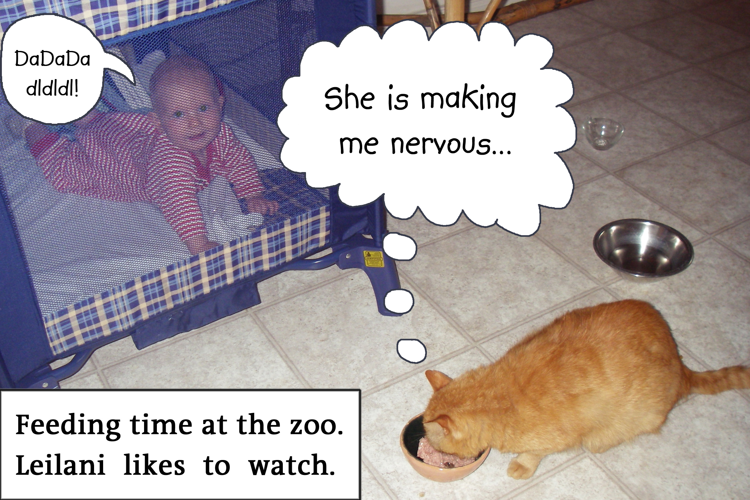 Leilani has been eating solids – much to the dismay of her naturopathic pediatrician – for almost 4 weeks. We started giving them to her because she sits with us at the dinner table, sees us eat, reaches for our food, and seems to really, really want to eat like the big people. I can’t deny our cats food, even if they have just been fed, much less the baby.