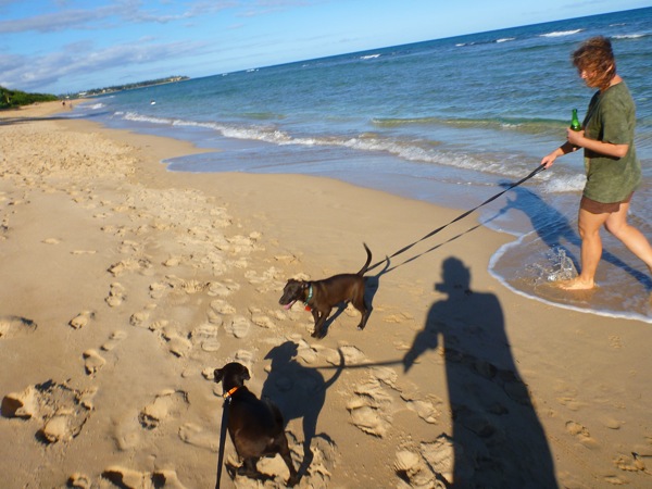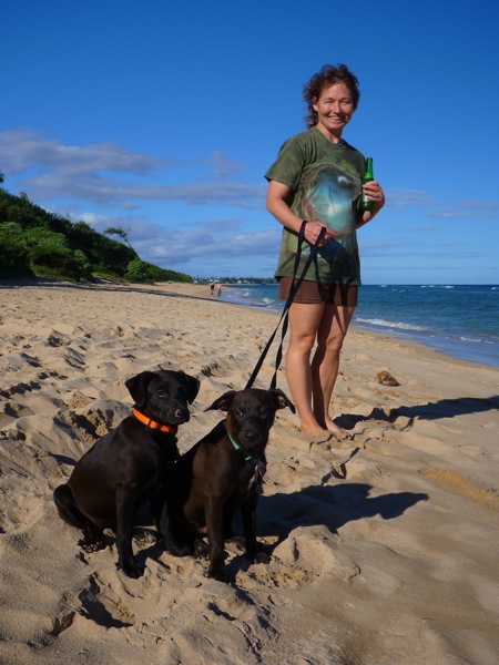 The dogs sometimes still corner him, or chase him a little when he runs, but I worry a lot less about them hurting him now. Twice a day they get yelled at, or sent outside for cat related crimes, but they behave worse with shoes and plants, especially bromeliads, bananas and lilies. They only ruined one pair of Leilani’s shoes so far, but chewed a bit and hid visitor’s shoes, and our flip-flops a lot. Bromeliads they shred completely. My nice front garden suffered quite a bit… They don’t take baths in their indoor water bowls anymore since we gave them a wading pool.