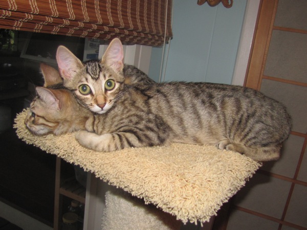 The kittens are surprisingly well behaved, the squirt gun I got for training them is still in it’s original packaging in the drawer, Jahi is upset for half a day if I even yell at her, but a firm “No!” and shaking my index finger at them (I learned that trick from my mom) has always worked with her. Benu was a bit more persistent, especially trying to get to our food on the table, but still stopped after just firm talking, just a few more times. The kittens know their names and come when called, but have not learned any tricks yet.